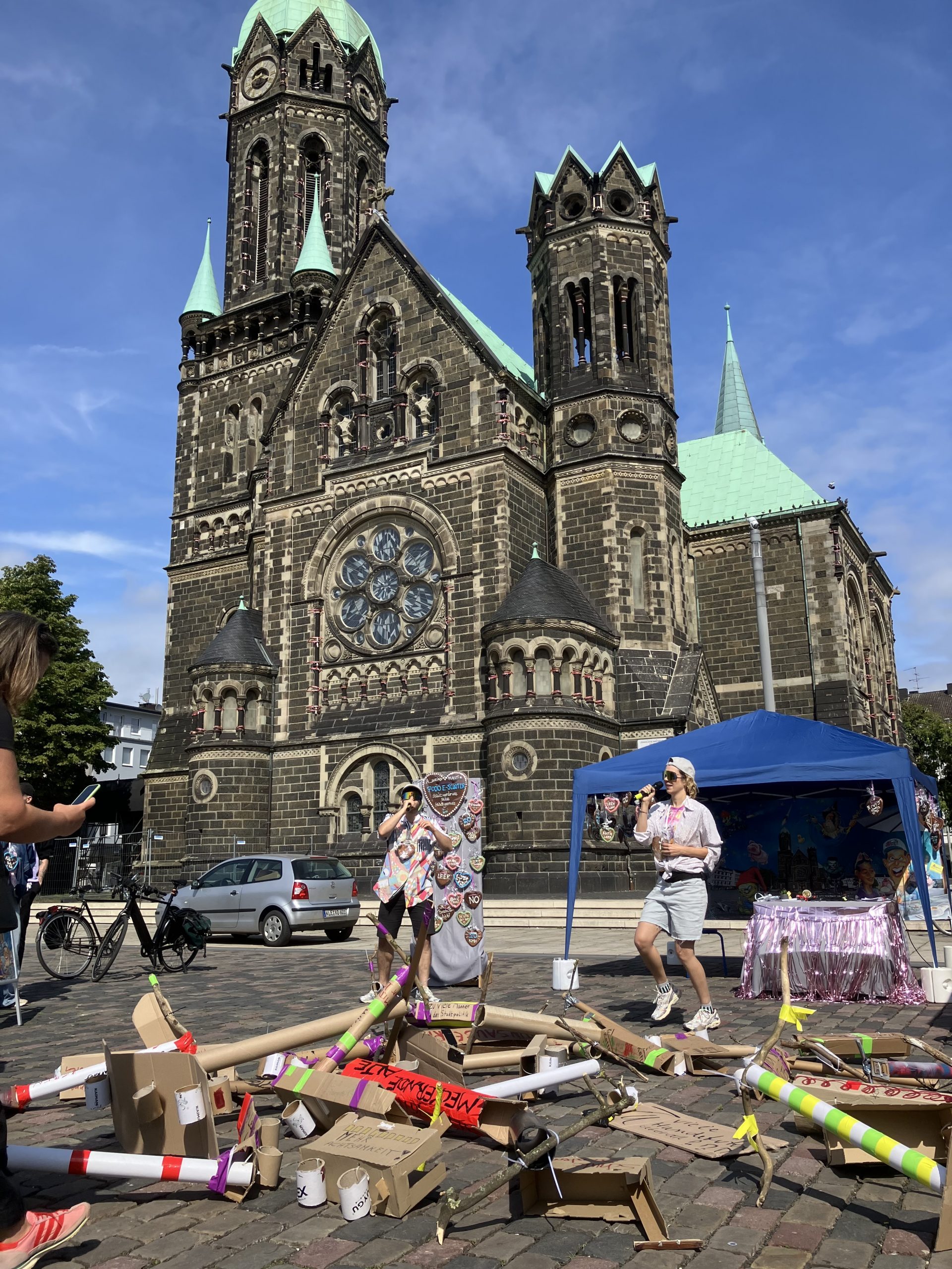 Die aktuellen Stipendiat*innen Katze Greeven und Todor Joe Musev laden nun mit ihrer gemeinsam gegründeten „Agentur für was im Raum steht“ zur „Kleinsten Rheydter Kirmes“ ein, eine partizipative Kunst-Aktion auf dem Rheydter Marktplatz. Ihr Ziel: 7.000 E-Scooter auf den Marktplatz „zu schütten“, jeder einzelne selbst gebaut und mit einer Beschwerde aus der Bevölkerung versehen. Ihr Aufruf: „Was stört dich? Beschwer dich! […] Werde auch du Teil der A_SOZIALEN PLASTIK und schicke uns deine Beschwerde.“ Da es sich um eine Kirmes handelt, dürfen Lebkuchenherzen und Kirmesmusik natürlich nicht fehlen – beide Elemente sind ebenfalls künstlerisch interpretiert und gestaltet. Die Herzen sind mit eher untypischen Schriftzügen wie „I love Lithium“ oder „Akku leer?“ versehen. Der Kirmesschlager „ROLLÉ, ROLLÉ, ROLLÉ, ROLLÉ“ ist von den Künstler*innen eigens für die Aktion geschrieben worden.